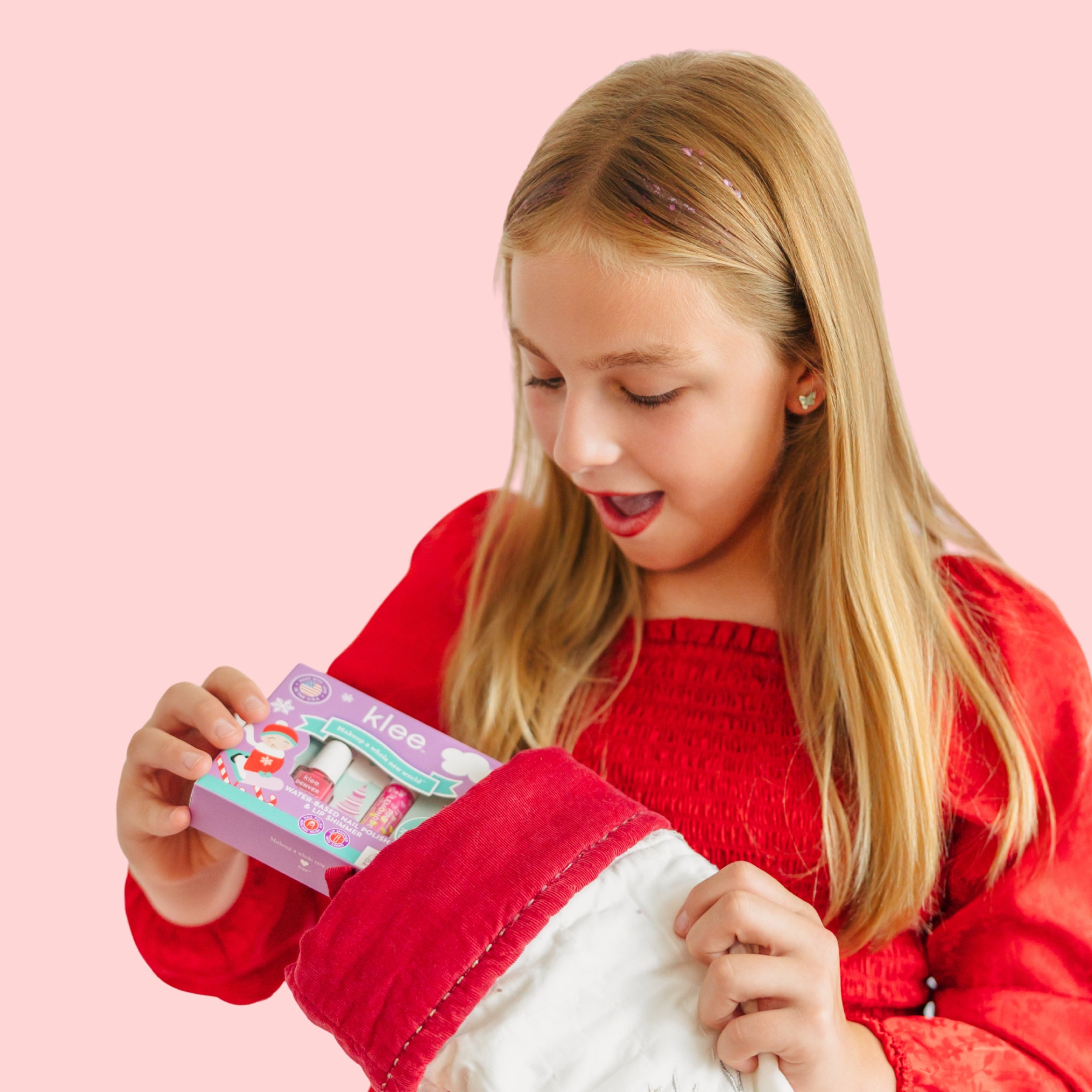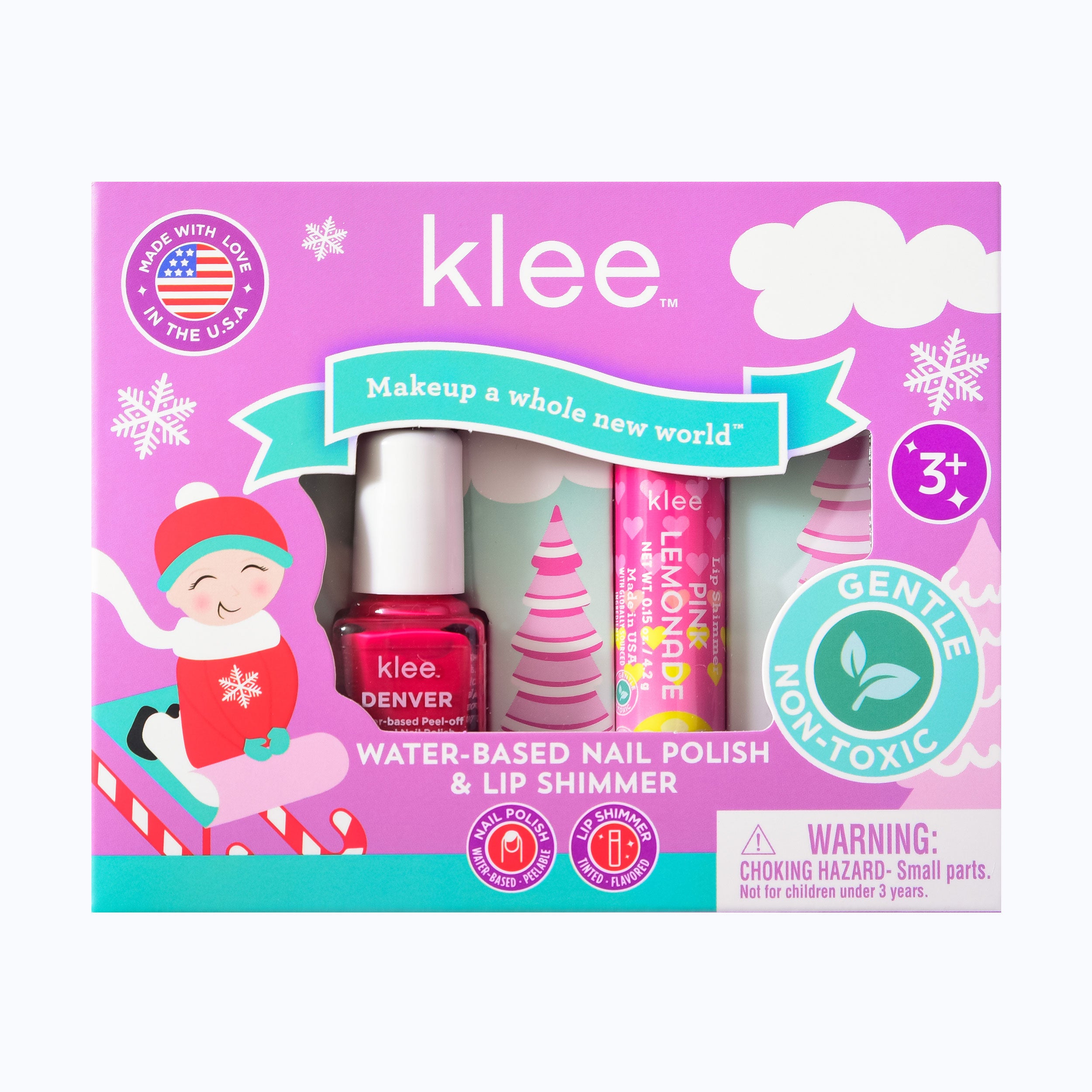 This perfect stocking stuffer includes a glossy water-based nail polish and a delicious Pink Lemonade lip shimmer.