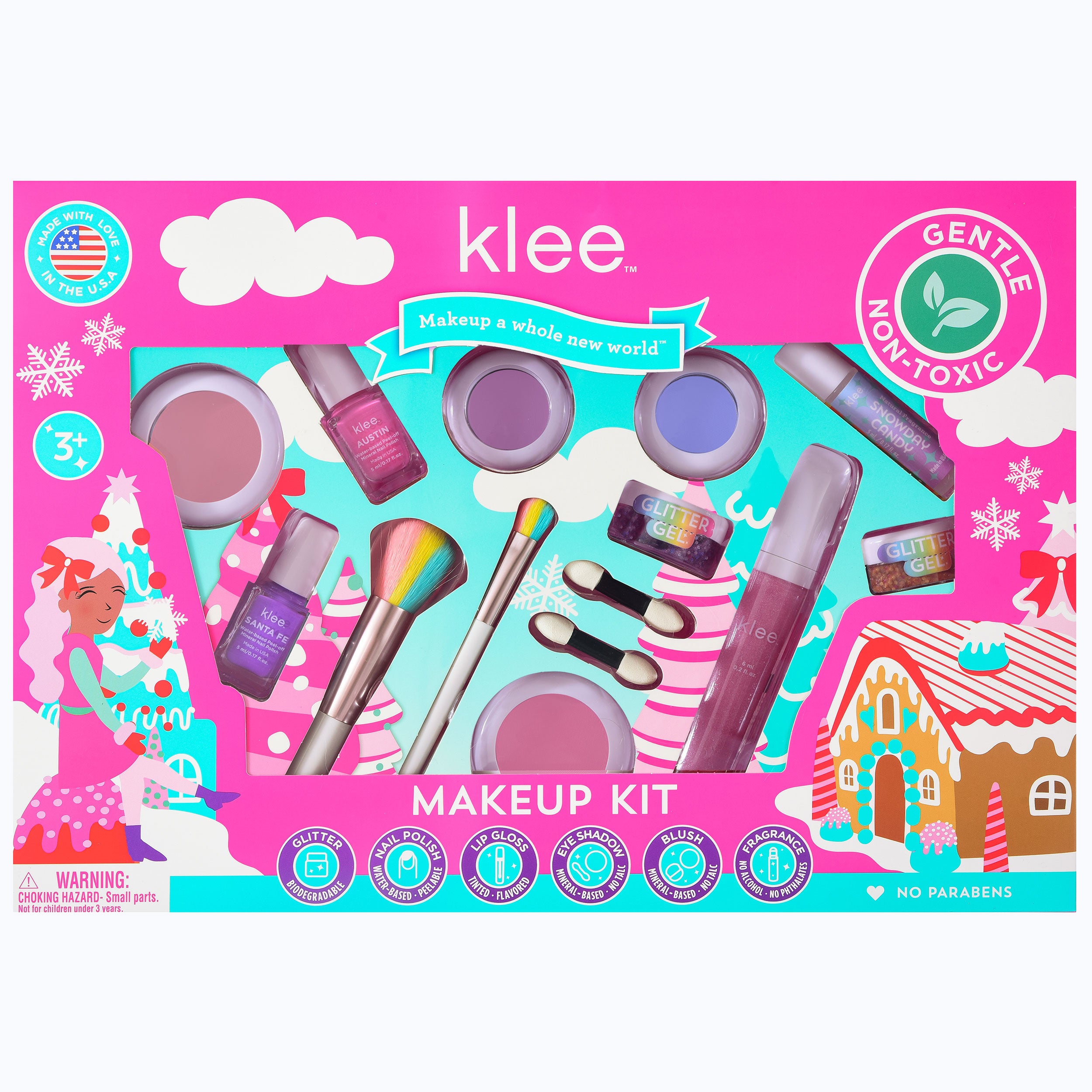 The kit includes two eye shadow compacts, two blushes, two peelable, water-based nail polishes, a flavored lip gloss, two jars of biodegradable glitter gel, a roll-on natural fragrance, and a set of full-size rainbow powder brushes.
